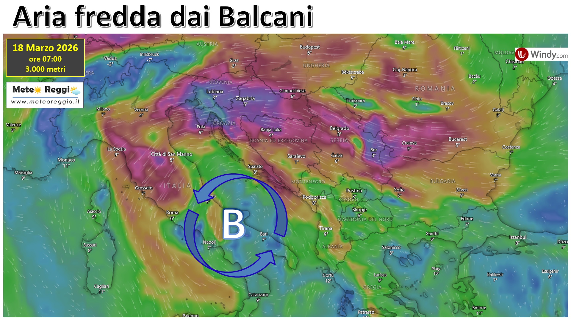 Il primo è sceso dalle Alpi ieri sera e ci ha tenuto compagnia senza grosse conseguenze, ma il secondo si prepara da est e avanza a gran velocità. Un muro compatto avanza spinto da venti in quota che arrivano dai Balcani e dalla lontana Ucraina/Mar Nero. Nulla di artico, ma un freddo secco continentale in quota che interagisce con un po' dell'umidità presente nell'Adriatico.