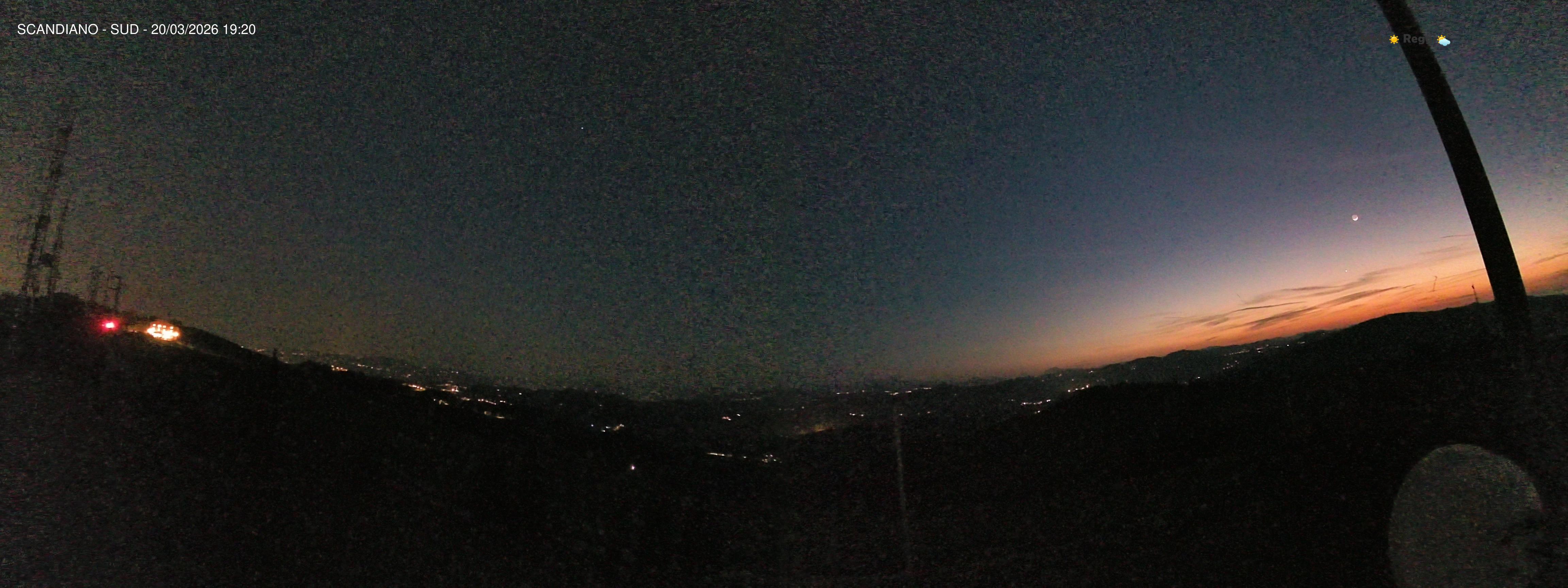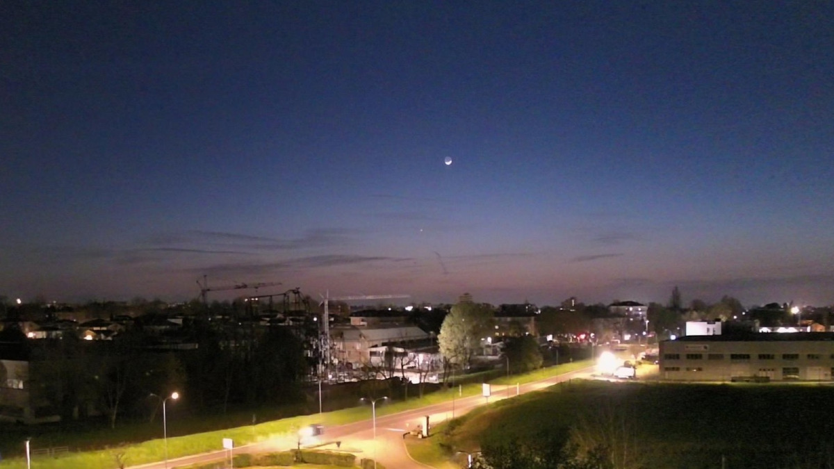 Primo tramonto di Primavera nel cielo reggiano. Ad ovest la linea del tramonto è dominata da una fantastica Luna che sfiora il luminosissimo pianeta Venere mentre Giove è alto nel cielo sulle nostre teste.