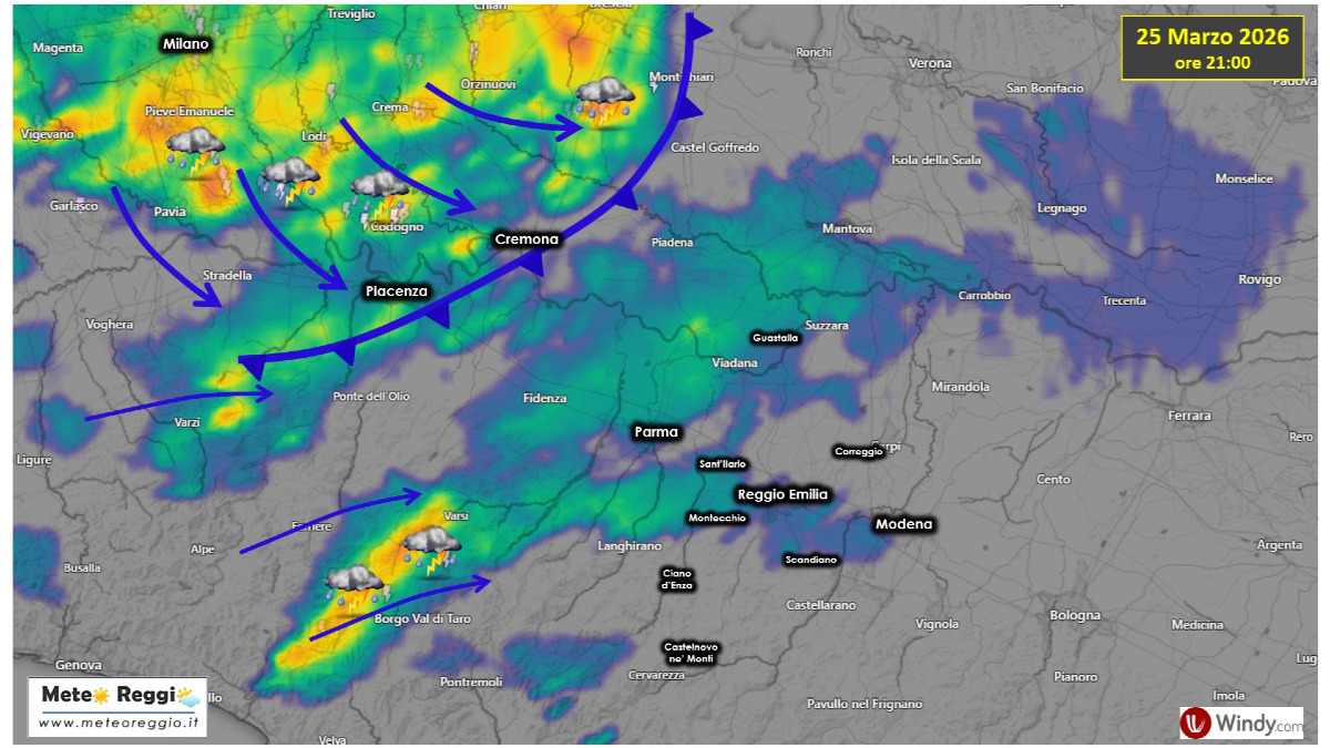 Un secondo blocco temporalesco ben più massiccio, invece, è in discesa dalla Lombardia tra Piacenza e Cremona e potrebbe raggiungerci nelle prossime ore.