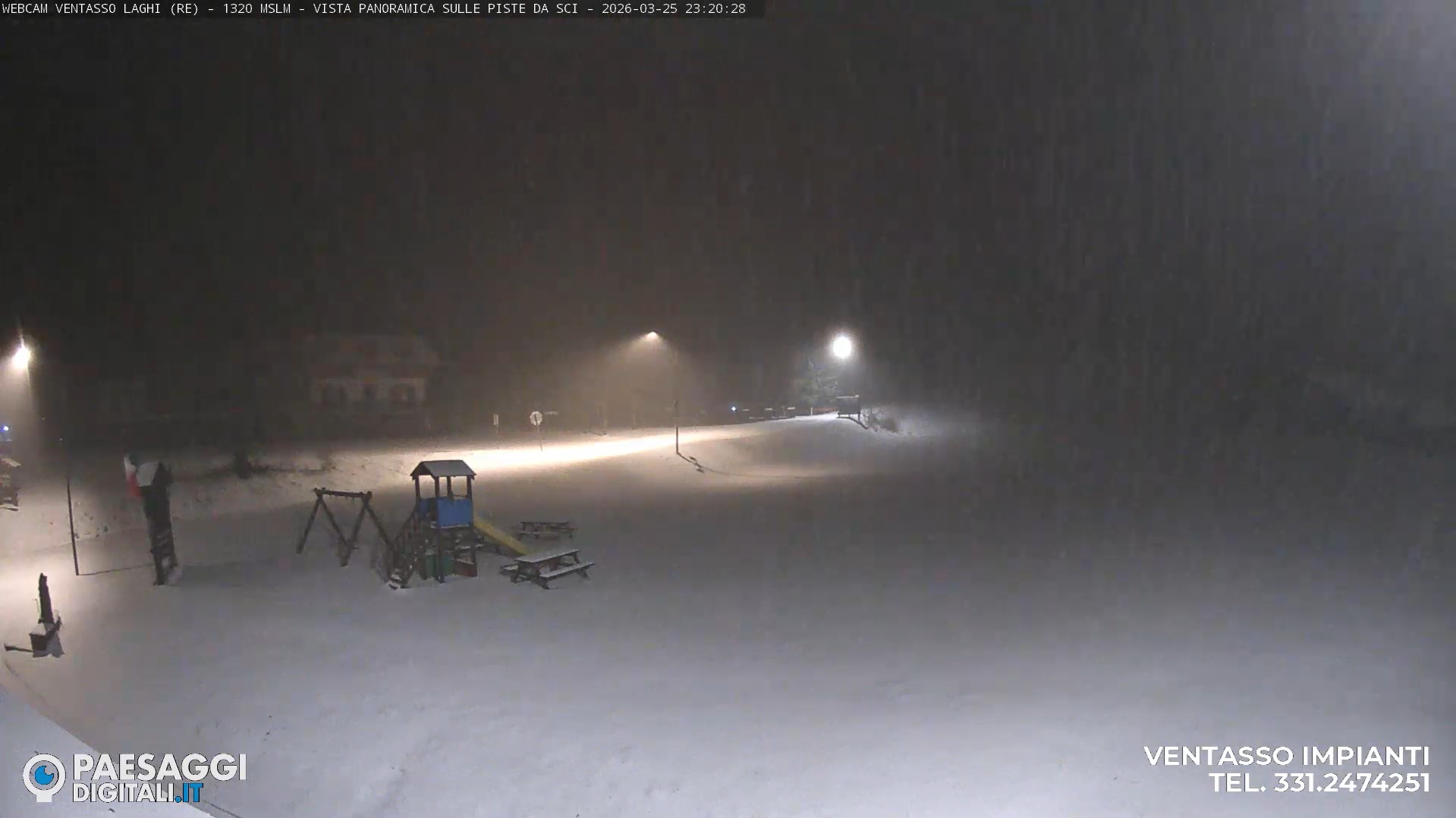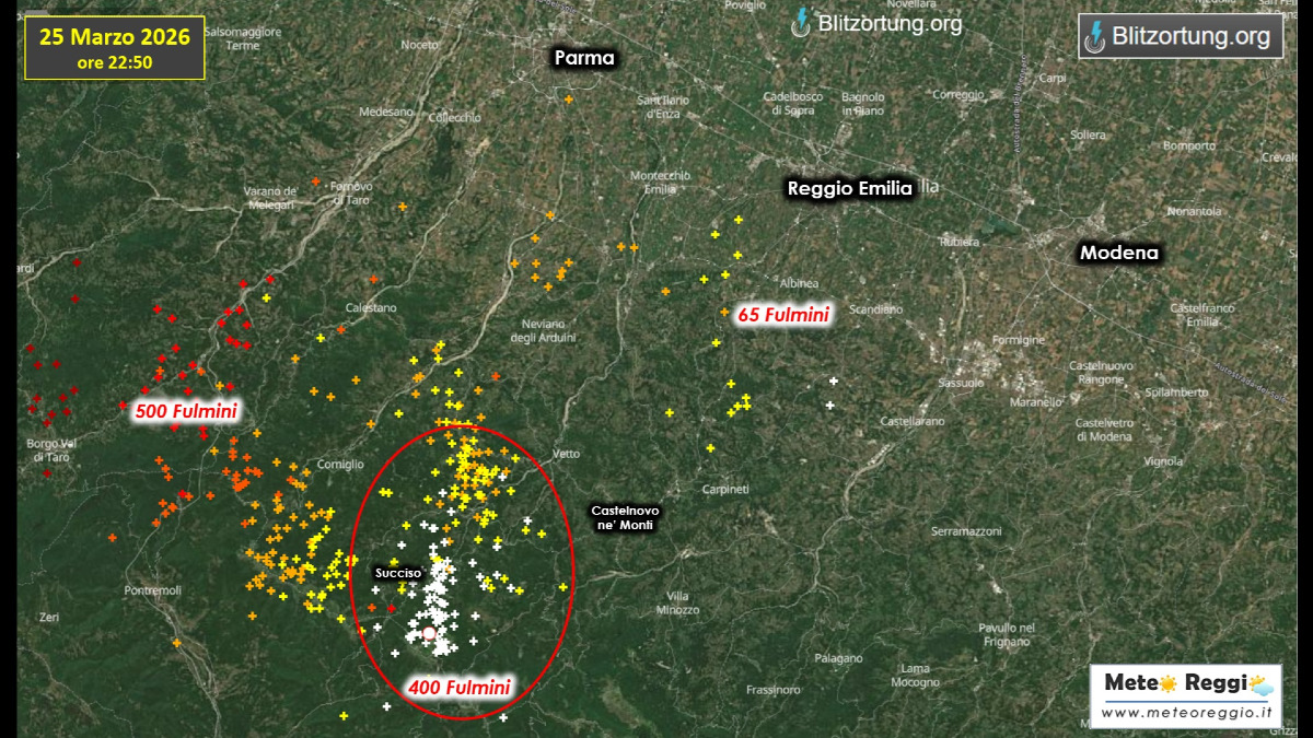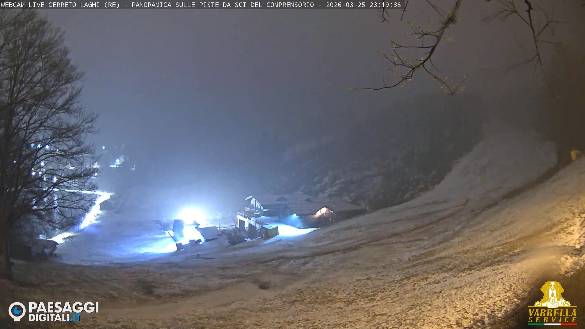 E' ancora forte, però, l'attività temporalesca sul Crinale con nevicate che hanno spolverato di bianco il suolo dalle 22:30 già attorno ai 1.200/1.300 metri con deposizione di una sottile patina anche sulle strade del Passo del Cerreto.