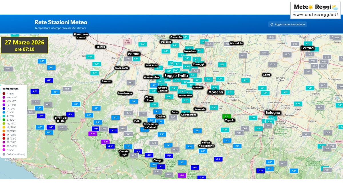 Abbiamo un po' di brezza sulla Pianura e Pedecollinare, motivo per cui abbiamo queste temperature in Pianura e a Scandiano. Si tratta di una corrente debole di Foehn che scende dalla valle dell'Adige e dal Lago di Garda. Le correnti da nord che non hanno scavalcato le Alpi hanno trovato un pertugio dal Brennero e condizionano queste prime ore del giorno.