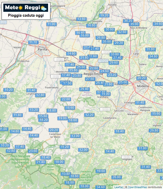 Chi ama l'Estate dissentirà sicuramente da quanto abbiamo affermato, ma basterà portare pazienza qualche giorno e il caldo farà il suo ritorno con convinzione e già da domani il Sole sarà protagonista in cielo. Temperature minime di tutt'altro genere rispetto alla notte tropicale di 24 ore fa: Minime Odierne _______________ 9,9°C a Ospitaletto 10,3°C a Febbio 10,7°C a Civago 11,5°C a Ligonchio 12,0°C a Castelnovo ne' Monti 12,1°C a Sarzano 12,1°C a Gombio 12,4°C a Collagna 12,6°C a Ramiseto 12,7°C a Villa Minozzo 12,8°C a Carpineti 13,1°C a Roncovetro 13,3°C a Baiso 13,3°C a Canossa 14,4°C a Ponte Cavola 14,8°C a San Valentino di Castellarano 14,9°C a Broletto di Albinea 15,1°C a Arceto 15,3°C a Bosco di Scandiano 15,3°C a San Bartolomeo 15,3°C a Quattro Castella 15,4°C a Scandiano 15,4°C a Bibbiano 15,4°C a Canali 15,6°C a Castellazzo 15,6°C a Montecchio Emilia 15,7°C a Codemondo 15,7°C a RCF Arena - San Maurizio 15,9°C a Cavriago 16,0°C a Roncocesi 16,0°C a Correggio 16,0°C a Prato di Correggio 16,1°C a Massenzatico 16,2°C a Reggio nell'Emilia 16,3°C a Sant'Ilario d'Enza 16,4°C a San Martino in Rio 16,4°C a Fabbrico 16,4°C a Novellara 16,4°C a Sesso 16,4°C a Villa Argine 16,5°C a Bagnolo in Piano 16,5°C a Rio Saliceto 16,6°C a Guastalla 16,6°C a Rolo 16,6°C a Cadelbosco 16,7°C a Santa Maria della Fossa 16,7°C a Santa Vittoria 16,8°C a Gualtieri 16,8°C a Reggiolo 16,8°C a Poviglio 16,8°C a Castelnovo di Sotto Ed ecco gli accumuli di pioggia sulla Provincia: 36.20 mm a Reggiolo 35.00 mm a Rolo 35.00 mm a Santa Maria della Fossa 33.80 mm a San Martino in Rio 32.60 mm a Fabbrico 30.60 mm a Novellara 29.60 mm a Prato di Correggio 29.40 mm a Broletto di Albinea 29.20 mm a Rio Saliceto 27.60 mm a Canali 27.60 mm a Sesso 27.40 mm a Villa Argine 27.40 mm a Correggio 26.80 mm a Santa Vittoria 25.60 mm a Codemondo 25.40 mm a Bosco di Scandiano 24.60 mm a RCF Arena - San Maurizio 23.80 mm a San Bartolomeo 23.60 mm a Collagna 23.20 mm a Castellazzo 22.60 mm a Reggio nell'Emilia 22.00 mm a Canossa 21.80 mm a Roncocesi 21.60 mm a Arceto 21.40 mm a Ospitaletto 21.40 mm a Cadelbosco 20.20 mm a Castelnovo ne' Monti 19.20 mm a Guastalla 19.00 mm a Gombio 19.00 mm a Scandiano 18.80 mm a Roncovetro 18.60 mm a Carpineti 18.60 mm a Sarzano 18.40 mm a Ligonchio 18.20 mm a Vetto 18.00 mm a Febbio 17.40 mm a Ca' de Caroli 17.40 mm a Succiso 17.40 mm a Montecchio Emilia 17.40 mm a Bibbiano 17.00 mm a Quattro Castella 16.80 mm a Gualtieri 16.60 mm a Quattro Castella 16.40 mm a Poviglio 16.00 mm a Castelnovo di Sotto 15.80 mm a Cavriago 15.80 mm a Vetto 14.60 mm a Sant'Ilario d'Enza 14.40 mm a Ramiseto 13.80 mm a Civago 13.60 mm a Boretto 13.00 mm a Ponte Cavola 12.20 mm a Baiso 11.20 mm a Villa Minozzo