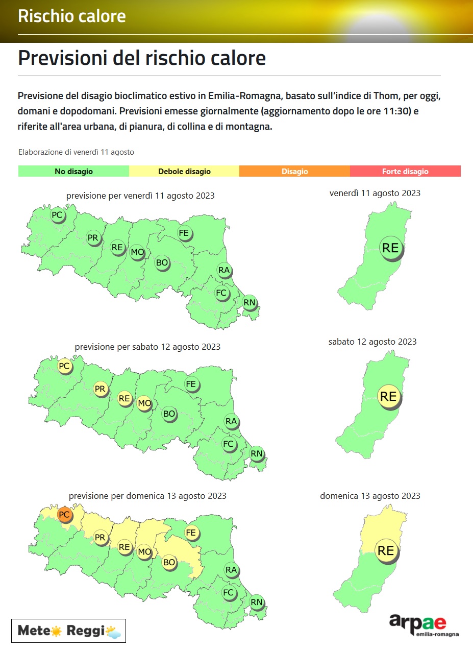 Oggi non abbiamo alcuna condizione di disagio bioclimatico, anche se i termometri iniziano a varcare la soglia dei 32°C in diverse stazioni. Umidità sotto controllo e nella notte abbiamo toccato i 20°C solamente in centro a Reggio Emilia.