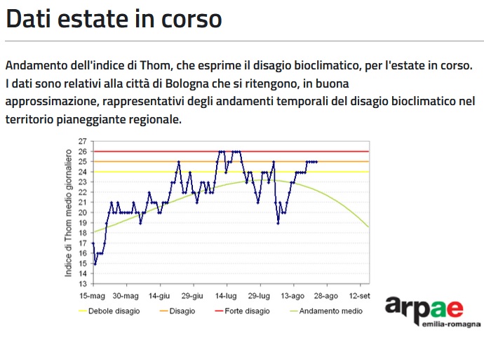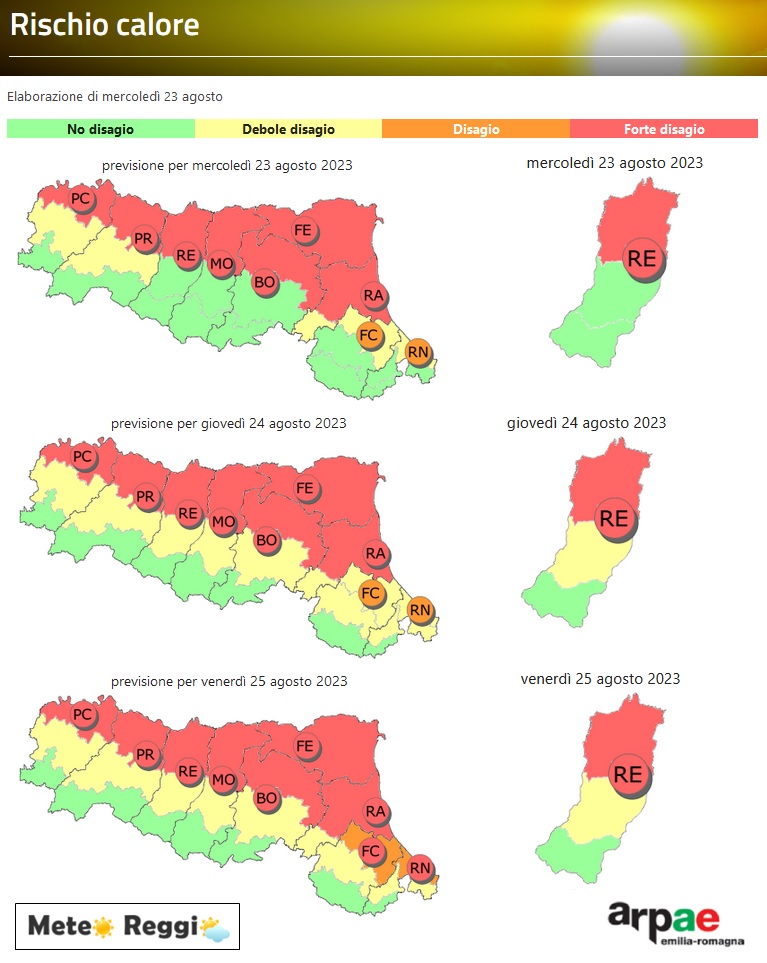 Da domani il disagio bioclimatico sarà percettibile anche sulle zone di Collina con un rischio debole. La soglia dei 30°C è ormai giunta alla Montagna, ma senza alcun disagio per quelle zone.
