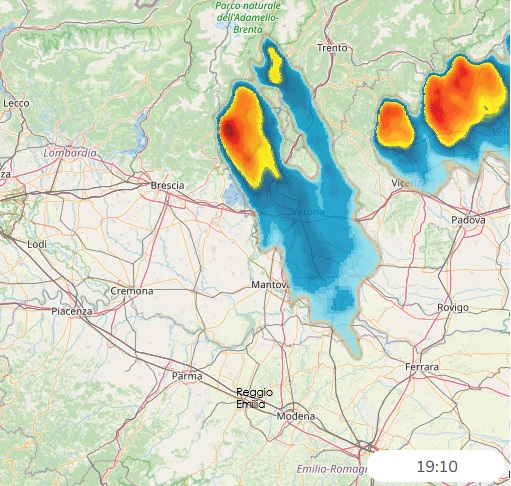 A nord è spuntato un Cumulonembo inaspettato, si tratta dell'estensione più occidentale di una linea temporalesca che è riuscita a valicare le Alpi e si sta affacciando sulla Pianura. A breve questa cella raggiungerà il Lago di Garda crescendo d'intensità e spinta dal vento potrebbe arrivare ai margini della Pianura.