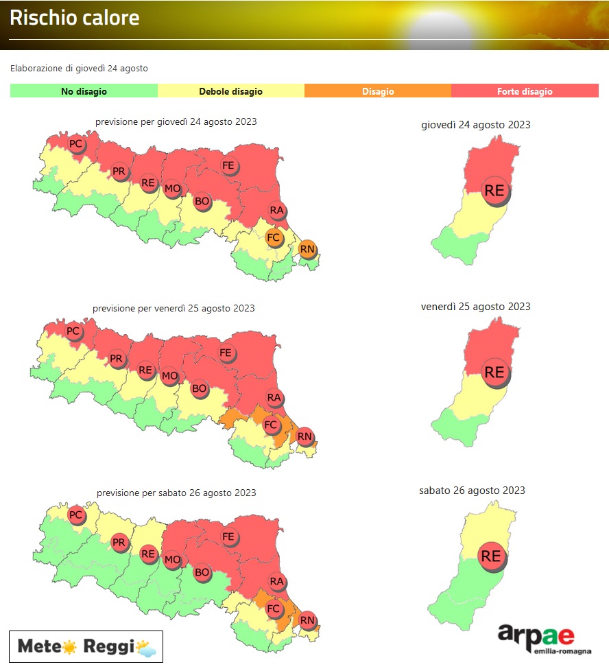 Forte disagio, quindi, per tutta la Pianura e i centri abitati fino alle prime Colline. Disagio debole sulla fascia collinare dove nel pomeriggio i termometri saliranno fino ai 37°C e dove abbiamo i valori più alti di temperatura minima con 26°/27°C.