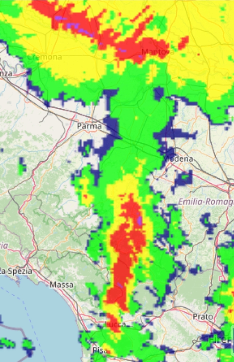 Prosegue l'attività temporalesca sulla nostra provincia. Lo fa con un'unica lingua sottile di pioggia che da Pisa arriva a noi.