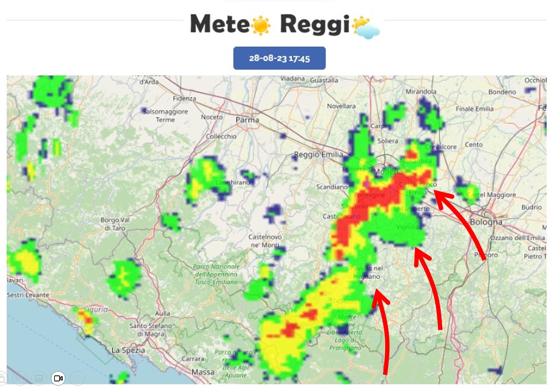 Ancora una volta è dall'appennino modenese che arriva un affondo temporalesco. Un'unica lunga linea si estende lungo il Secchia e sta per essere valicata in questi momenti.