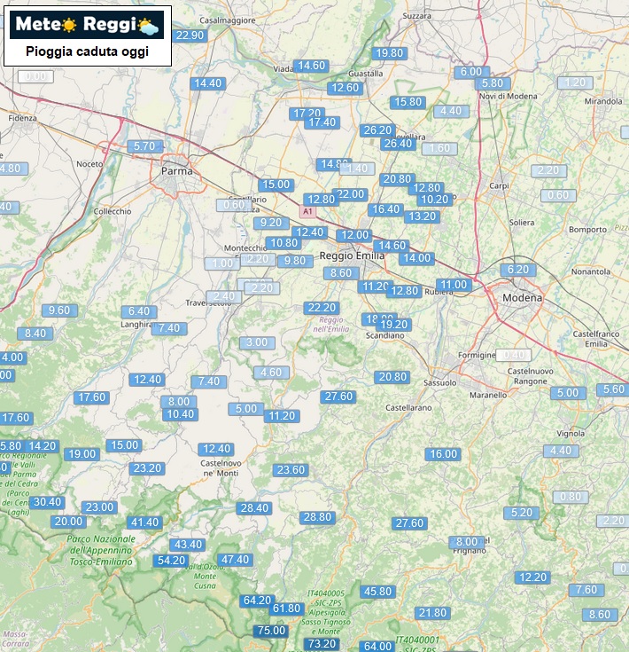 Qualche zona è rimasta in ombra, alcune sono state raggiunte dalla pioggia solo in quest'ultima ora e i dati non sono aggiornatissimi, ma ci danno un'idea di quello che sta avvenendo sul reggiano.