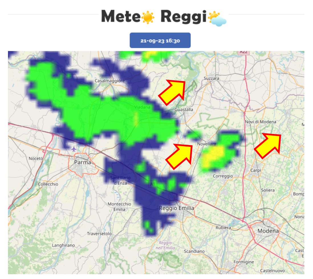 Velocemente la perturbazione si sta allargando verso il reggiano e un nucleo vivace è presente tra Correggio e Novellara in direzione Campagnola e Rio Saliceto.