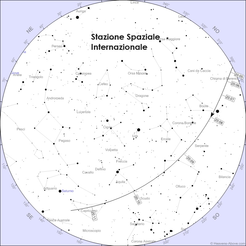 Appuntamento alle 20:08 con la Stazione Spaziale Internazionale che farà un luminosissimo e lungo passaggio da Arturo a Saturno, che raggiungerà alle 20:11 dove si spegnerà.