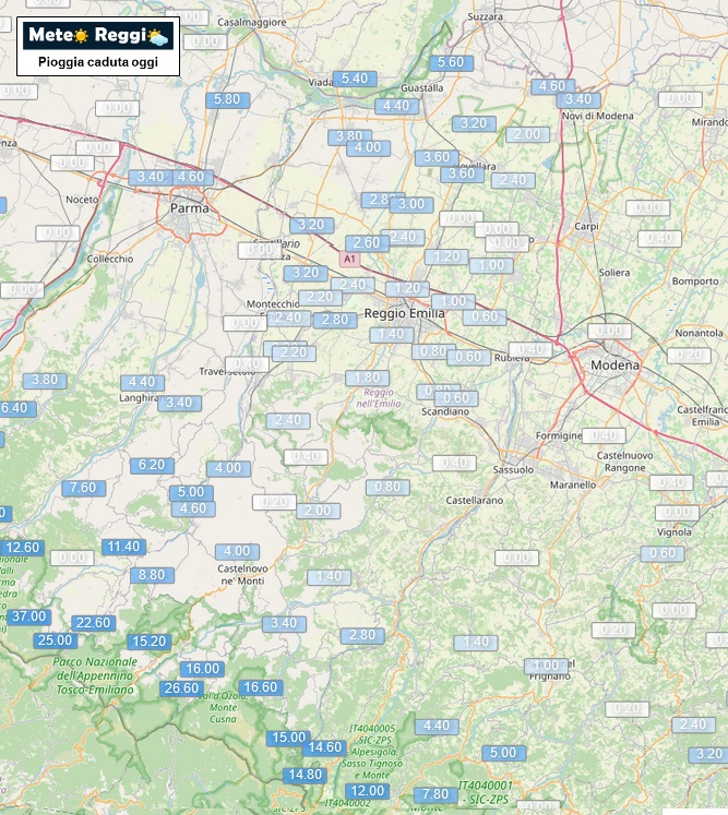 Piogge moderate sul nostro Appennino e pioviggini sulla Pianura che a nord della via Emilia quasi non portano ad accumulo al suolo. Raffiche di vento attorno ai 60 Km/h nel reggiano, con punte superiori nelle valli e sulle cresete.