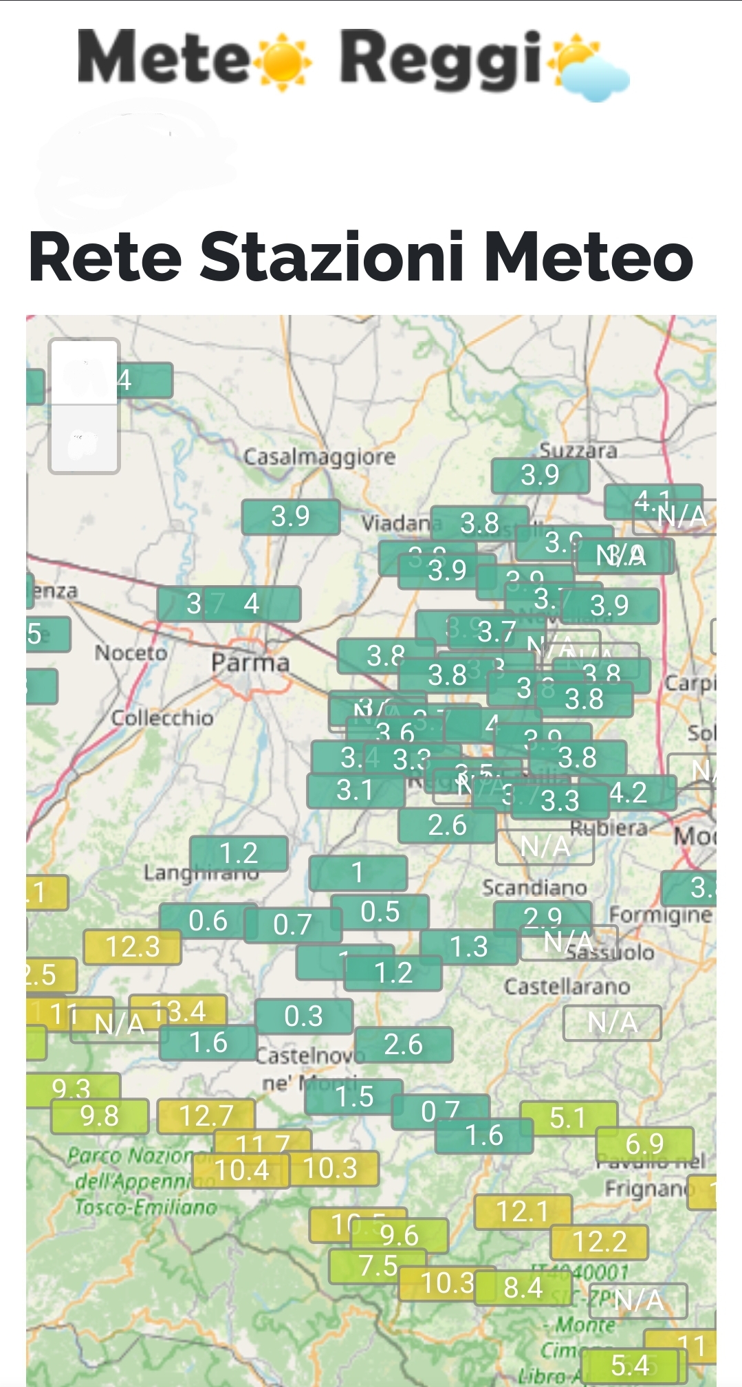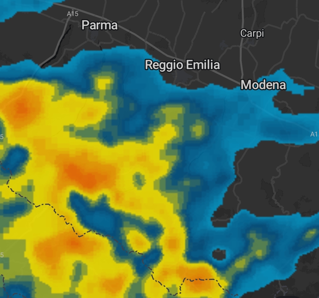 Precipitazioni piovose moderate sono in spostamento verso nord est e a breve interesseranno le valli del Tresinaro-Secchia. Ora il nucleo più intenso è nell'area tra Ventasso e Castelnovo ne' Monti.