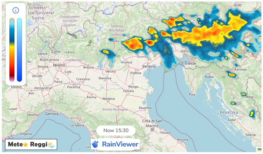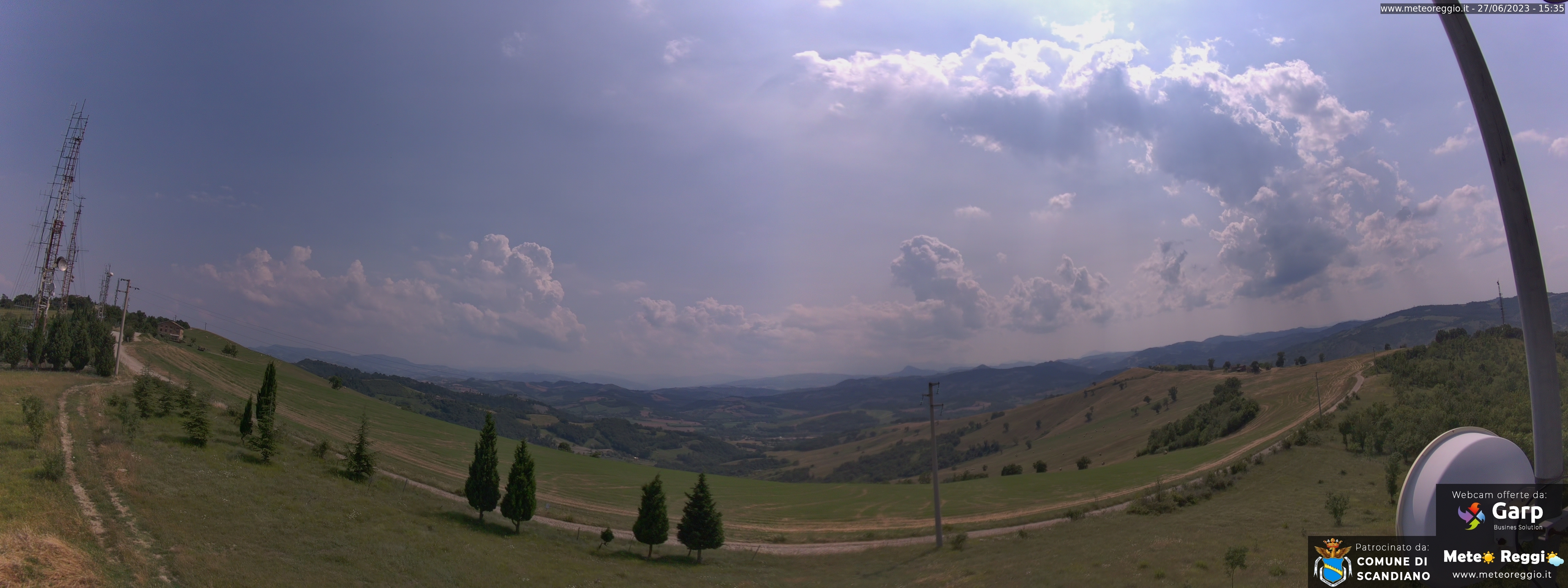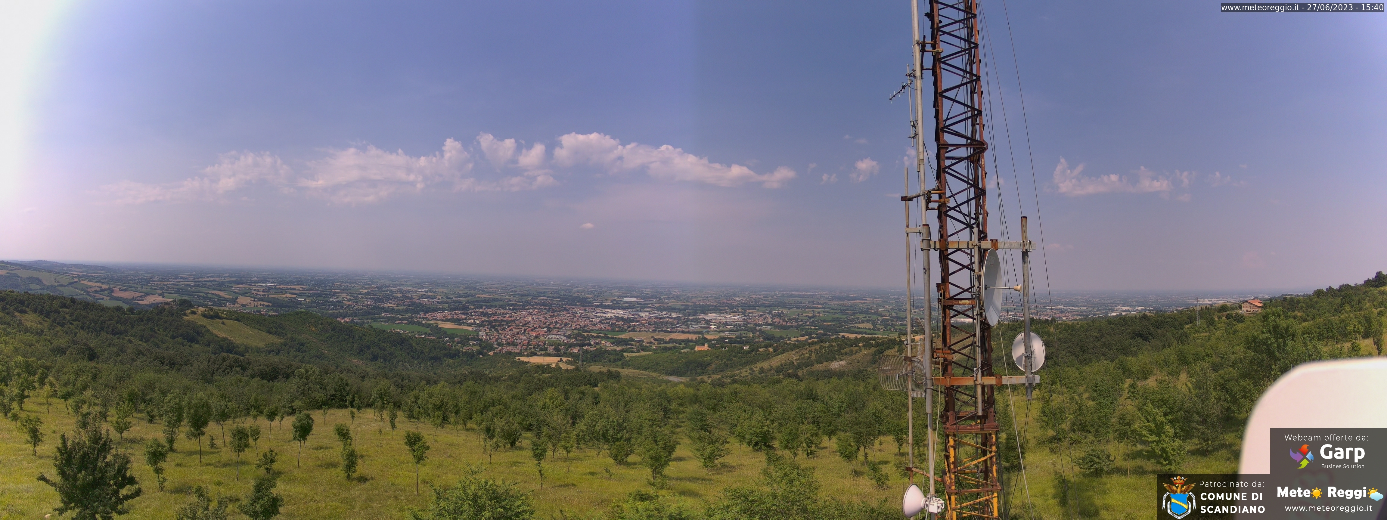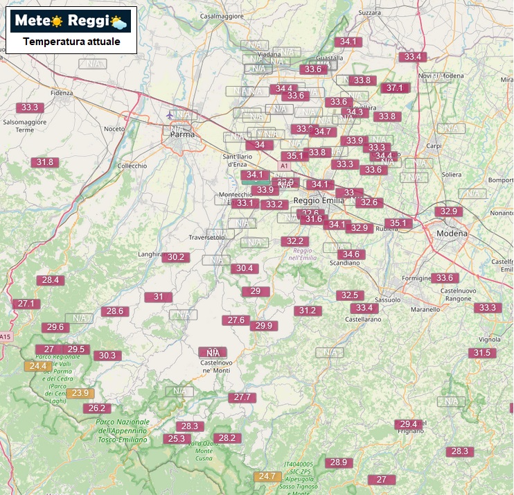 Un soffio di aria caldo sta spingendo diversi termometri della Pianura reggiana oltre la soglia dei 35°C, un valore reso ancora più; fastidioso da un po' di umidità che ne aggrava la percezione nei soggetti più sensibili agli sbalzi di calore. Attualmente non ci sono accenni di ostilità nel nostro cielo a parte un piccolo cumulo a metà della nostra Collina. Sulle Alpi orientali, però, si nota già una lunga linea temporalesca che rappresenta quella perturbazione che dovrebbe raggiungere la parte centro-orientale della Pianura Padana fino a toccare (molto probabilmente) anche il reggiano. Ecco cosa ci raccontano al momento i termometri reggiani: