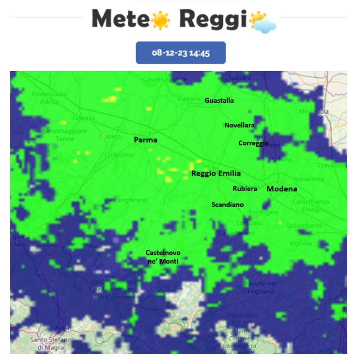 In Pianura, o comunque sotto i 300 metri, abbiamo piogge deboli che crescono d'intensità tra la Via Emilia e la periferia nord in direzione Correggio/Novellara.
