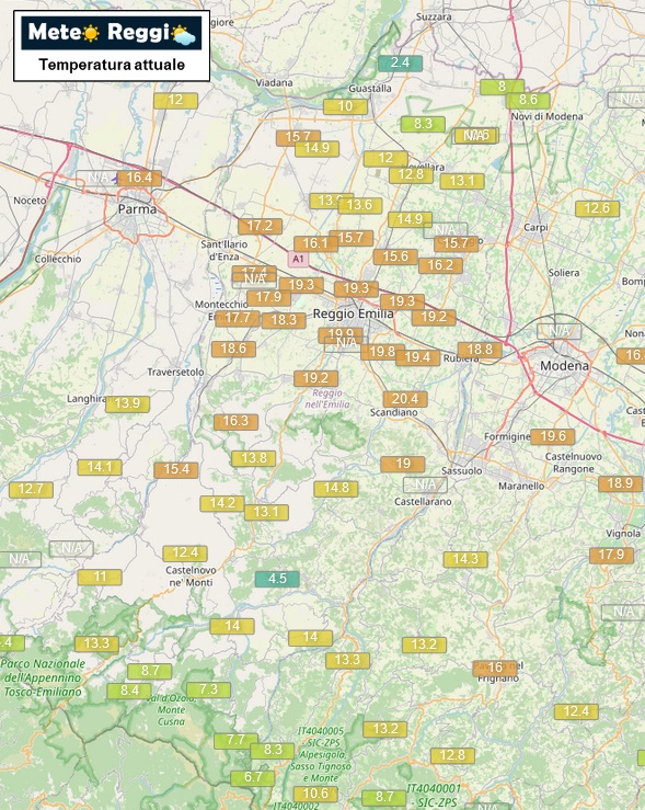 Bollettino Meteo delle 09:30 Buon inizio di fine settimana natalizio a tutti voi. La giornata di oggi vede ancora protagonista un forte vento di Foehn che scende dalle Alpi verso la Pianura e scorre dalla Lombardia verso l'Adriatico urtando le prime colline reggiane. Per tale ragione abbiamo delle temperature più alte rispetto a ieri proprio sulla Pedecollinare dove si superano i 20°C in diverse stazioni. Fa più freddo dove il vento soffia in modo più marginale, specie nella Bassa ed in Montagna dove abbiamo 8°C. Il vento calerà solo dopo l'ora di cena, ma per tutta la sera i valori potrebbero mantenersi sopra soglia 10°C. Ecco i valori più alti raggiunti dai termometri fino ad ora: 21,4°C a Scandiano 20,0°C a San Valentino di Castellarano 20,0°C a Canali 19,8°C a Bosco di Scandiano 19,7°C a Broletto di Albinea 19,5°C a RCF Arena - San Maurizio 19,4°C a Arceto 19,3°C a Reggio nell'Emilia 19,3°C a Codemondo 19,2°C a Castellazzo 18,6°C a Quattro Castella 18,3°C a San Bartolomeo 17,9°C a Cavriago 17,7°C a Bibbiano 17,6°C a Massenzatico 17,4°C a Montecchio Emilia 17,3°C a Roncovetro 17,2°C a Sant'Ilario d'Enza 17,1°C a Canossa 16,9°C a Prato di Correggio 16,7°C a Villa Minozzo 16,5°C a Baiso 16,5°C a Gombio 16,5°C a Sesso 16,4°C a Roncocesi 16,1°C a Poviglio 16,1°C a Carpineti 16,0°C a Villa Argine 15,9°C a Bagnolo in Piano 15,8°C a Ramiseto 15,7°C a Correggio 15,5°C a Cadelbosco 15,2°C a Sarzano 15,2°C a Castelnovo di Sotto 15,0°C a Castelnovo ne' Monti 14,5°C a Collagna 14,2°C a Ligonchio 14,2°C a Santa Maria della Fossa 13,5°C a Santa Vittoria 13,1°C a Rio Saliceto 12,3°C a Febbio 11,8°C a Ospitaletto 11,4°C a Civago 10,8°C a Gualtieri 10,6°C a Fabbrico 9,5°C a Rolo 8,3°C a Novellara 8,1°C a Reggiolo 6,1°C a Guastalla 5,9°C a Ponte Cavola