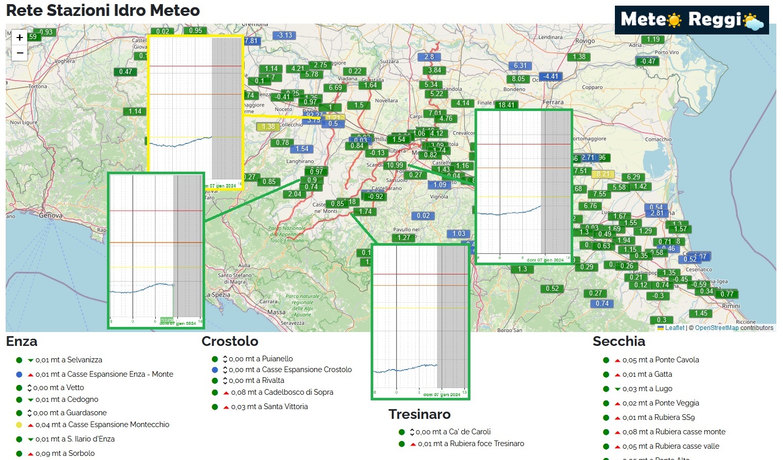 Come prevedibile, l'unico corso d'acqua che ha dato segni di nervosismo è stato l'Enza che ora supera soglia 1 nei pressi di Sant'Ilario. Un superamento che non preannuncia alcuna minaccia, il fiume già a Montecchio fa registrare una flessione verso il basso, quindi non avremo ulteriori aumenti di soglia.