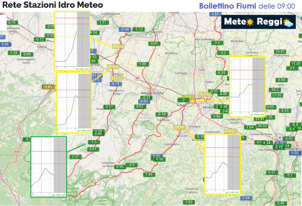 Meno in vista del cugino citato poco fa. Ha varcato soglia 1 nella notte a Gatta e a Lugo. L'onda di piena è transitata poi da Ponte Veggia prima delle 6 del mattino. L'onda ha raggiunto Rubiera ed il manufatto regolatore delle casse d'espansione. Niente di minaccioso, siamo sopra soglia 1 come da previsione e la situazione migliorerà nelle prossime ore.