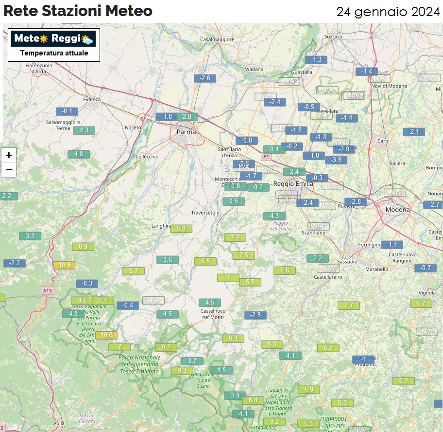 Di contro abbiamo una Pianura che torna a fare i conti con valori negativi che sfiorano i -4°C nelle campagne di Correggio.