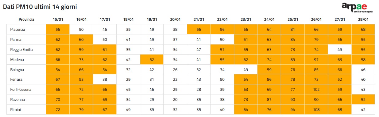Proseguono anche gli sforamenti dai livelli di legge, che negli ultimi 14 giorni per Reggio Emilia sono diventati ben 9.