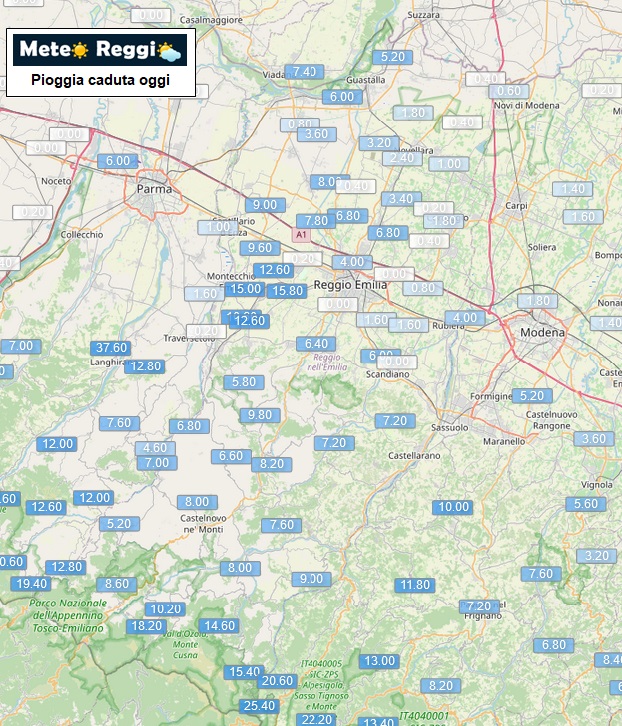 Pioggia caduta abbondante sulla bassa valle dell'Enza, mentre gli accumuli altrove sono scarsi o comunque nella norma.