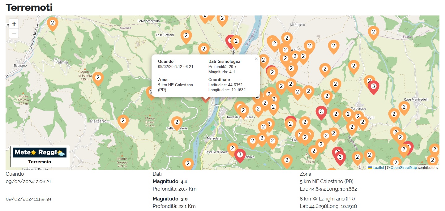 🎯 Bollettino Sismico delle 07:00 🎯 E' stata registrata alle 13:06 la scossa più violenta della serie di sismi che stanno interessando la pedecollinare parmense. Si tratta di un sisma di magnitudo 4.1 che si è manifestato sotto il torrente Baganza a Ferlaro vicino a Marzolara. Stesso sistema di faglie di tutti gli altri eventi che ormai si susseguono da 2 giorni e mezzo e che proseguiranno ancora per diverso tempo. Il sisma è stato avvertito distintamente anche nel reggiano, specie nella valle dell'Enza e a Reggio Emilia. Questa scossa è stata preceduta alle 13:00 da un evento di magnitudo 3.0