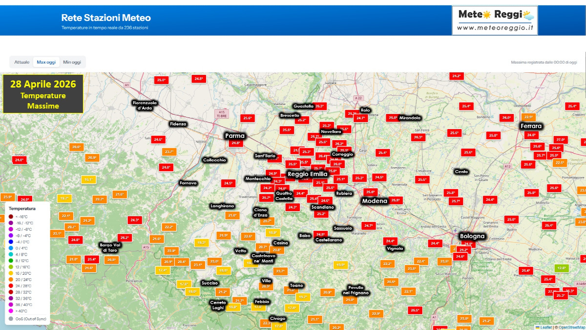 Queste coperture hanno favorito un lieve calo delle temperature massime che in Montagna si sono arrestate comunque su valori molto alti con 18°/19°C fino a Febbio e Ospitaletto. In Pianura il Sole ha risentito meno di queste nubi e i termometri sono saliti fino ai 26,4°C di Bagnolo in Piano.