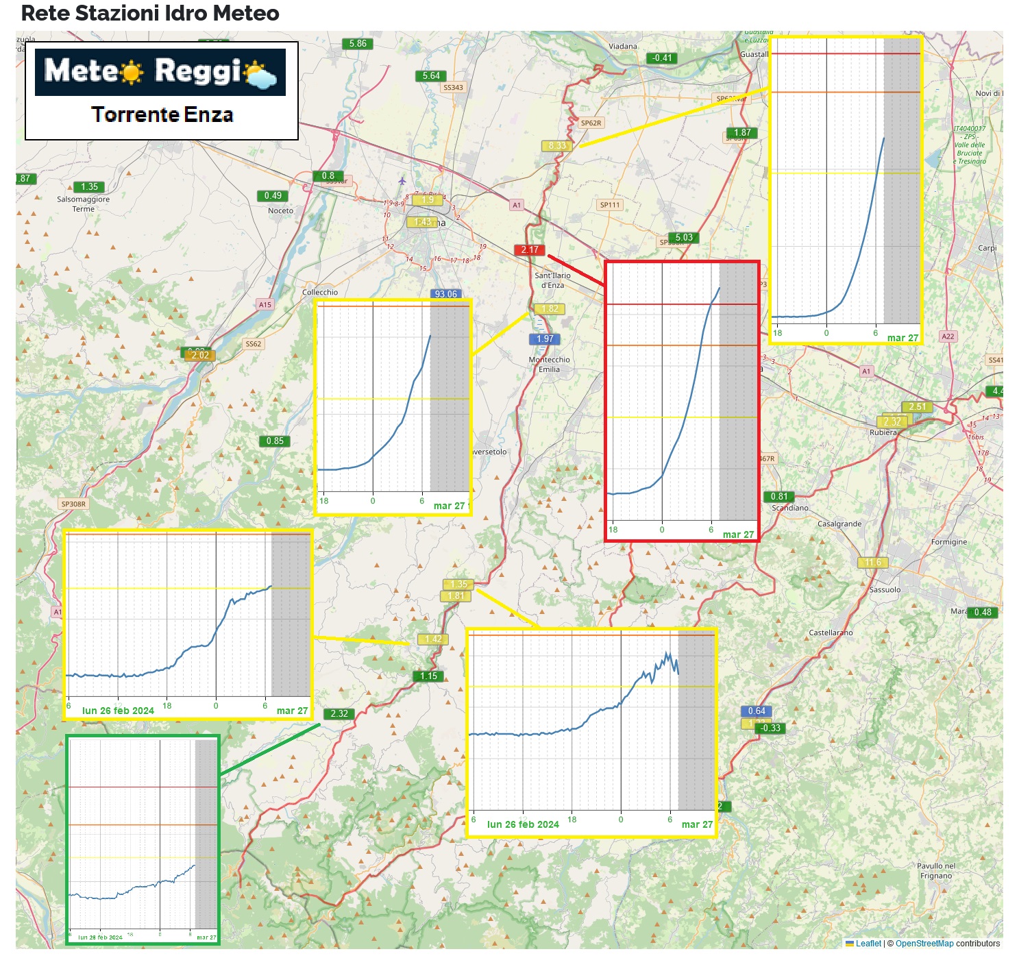 Sorvegliato speciale, nemmeno da dire, è il torrente Enza che addirittura supera soglia 3 a Sant'Ilario d'Enza.