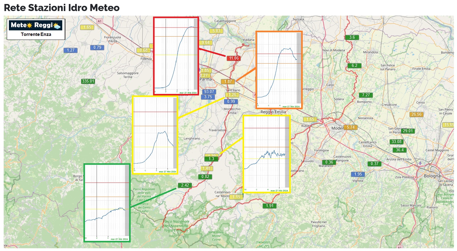 Il Coordinamento Provinciale di Protezione Civile e le Associazioni della zona dell'Enza sono state attivate per il monitoraggio della situazione. Al momento sembrano non esserci criticità o ansie legate a quanto sta accadendo. Le piogge cadono ancora, ma in modo meno efficace rispetto alla notte e mattinata.