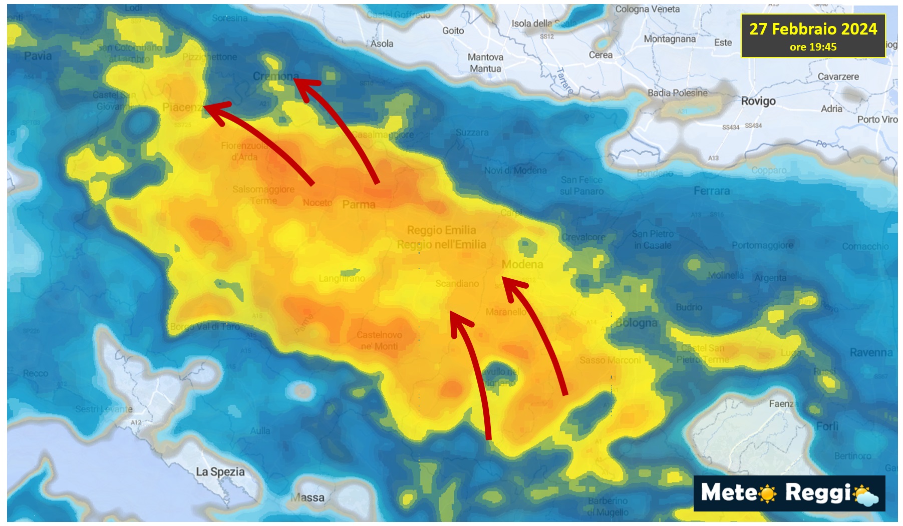 Gli accumuli di pioggia in Pianura spaziano dai 45 mm dei settori a confine con il parmense ai 25 mm dei settori a confine con il modenese. Più ci si allontana da questo scontro e meno piogge abbiamo. Quota neve che inevitabilmente è salita di molto ed ora piove copiosamente anche sulle nostre piste da sci.