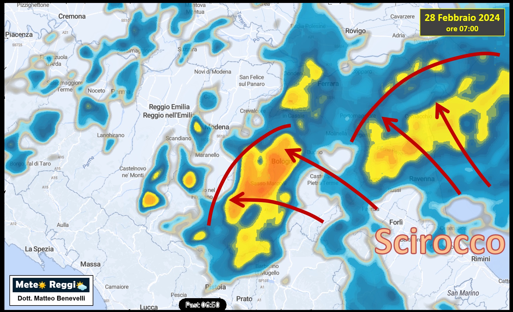 In questi minuti sta attraversando il fiume Secchia portando altre piogge verso la nostra Collina e immediatamente dopo la Pianura. Nulla di minaccioso, ma ci obbligherà a riprendere in mano gli ombrelli che avevamo appena riposto.