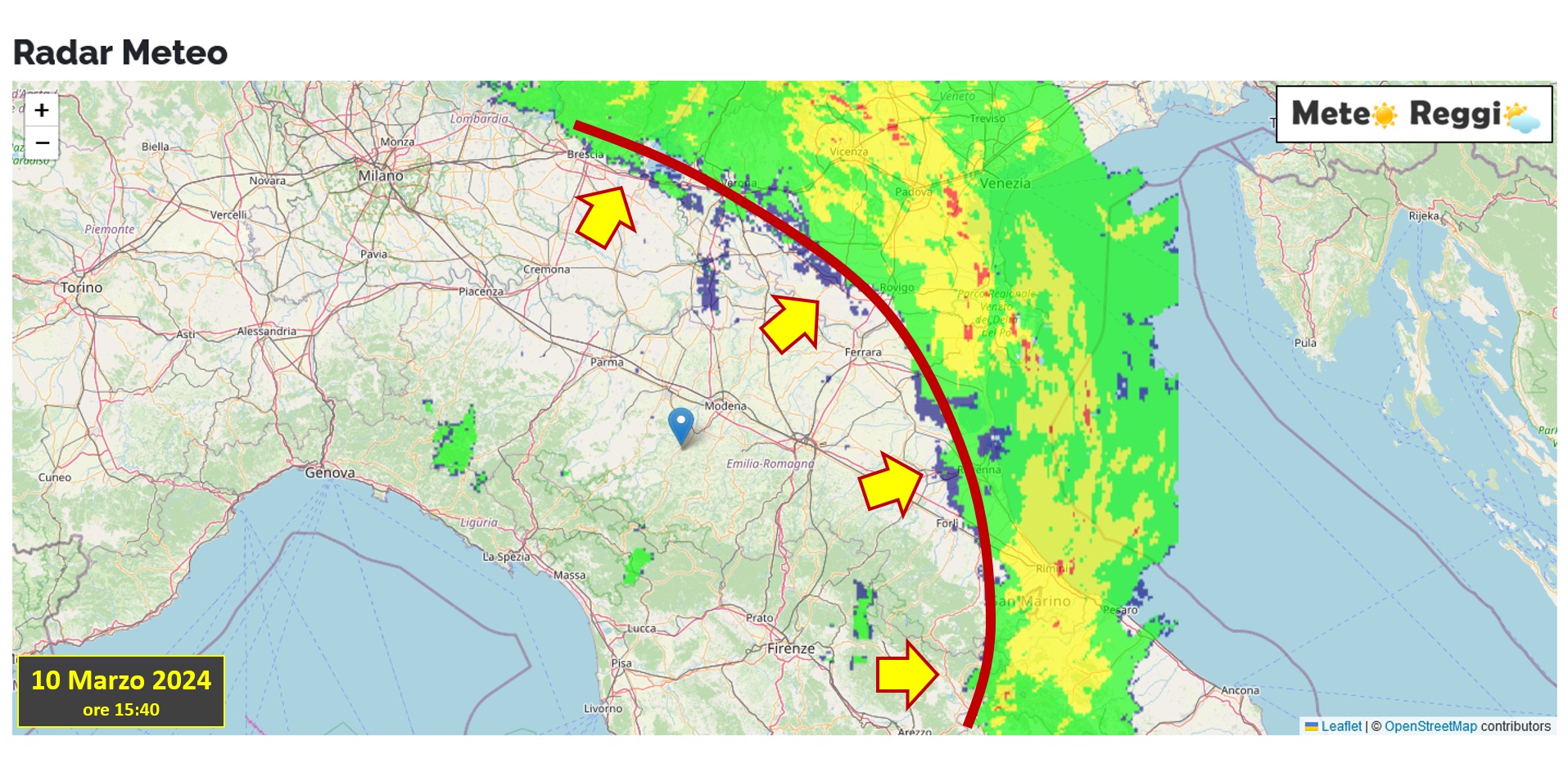 Il sistema instabile di questa mattina è "volato via col vento" in direzione nord-est. Un arco di pioggia intensa che si apre a ventaglio allontanandosi.
