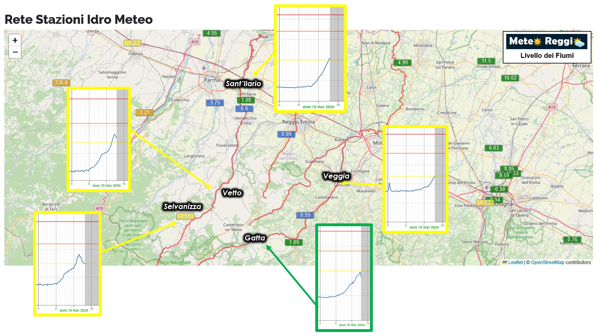 Il secondo blocco di piogge ha fatto crescere il Secchia che ora tocca soglia 1 al ponte di Veggia e Lugo. Così come tocca soglia 1 anche il torrente Enza a Sant'Ilario d'Enza. I torrrenti Crostolo e Tresinaro sono cresciuti leggermente, ma sono ancora lontani dalle rispettive soglie. Hanno dato segno di una piccola onda, ma del tutto trascurabile.