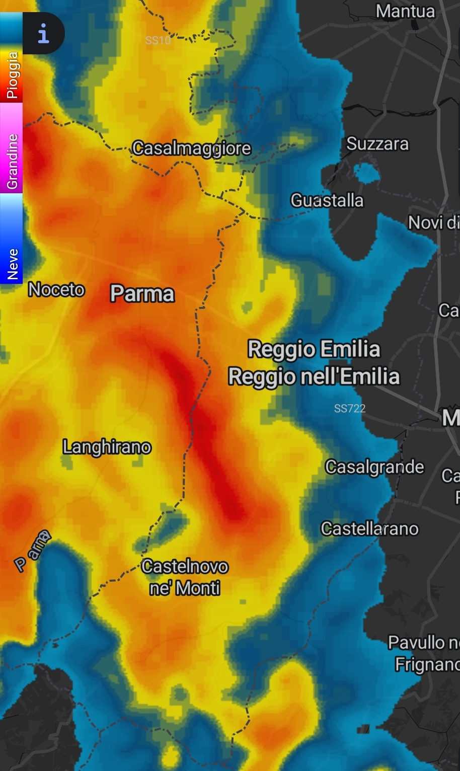 Rombi di tuono dalla valle dell'Enza. I temporali attesi nel parmense/piacentino hanno deciso di valicare l'Appennino più ad oriente e dalla provincia di Parma entreranno nel reggiano.