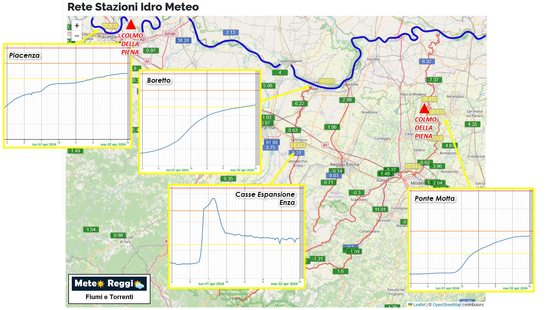 Cresce il livello del Grande Fiume alla stazione di Boretto, da mezzogiorno è stata superata soglia 1 ed il livello continuerà a crescere almeno fino a domani mattina attorno alle 09:00. Nel primo mattino, infatti, è atteso il transito del colmo che ora si trova poco dopo Piacenza (vedi foto). Probabilmente avremo un colmo che rimarrà di poco sotto la soglia dei 5 metri, circa una decina di centimetri in meno di quanto visto il 12 marzo scorso e una ventina in meno di quanto visto il 06 marzo scorso. Avremo, quindi, un modesto allagamento delle aree di golena.