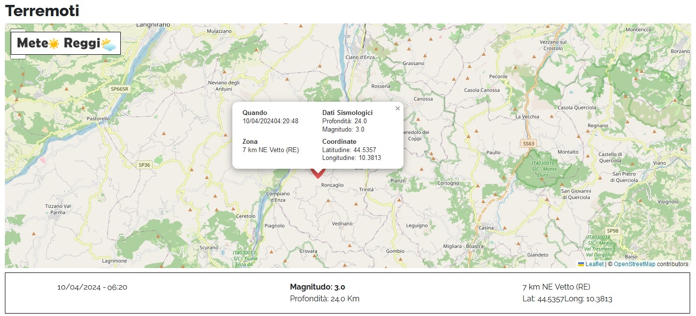 Una modesta scossa sismica si è presentata questa mattina all'alba nella valle dell'Enza. Un evento che ha raggiunto magnitudo 3.0 e che si è manifestato alle 06:20 del mattino. Nulla di troppo intenso, ma percettibile per una parte della popolazione nonostante i 24 km di profondità.