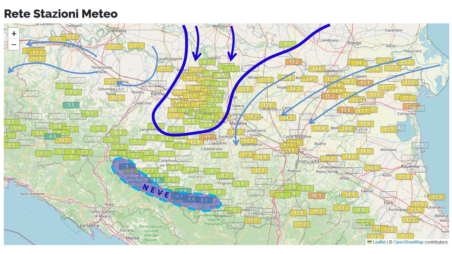 La pioggia, invece, sta interessando la zona di contatto tra le due correnti d'aria contrapposte. Attualmente piove più che altro sulla riva destra del Secchia, con pioviggini intermittenti sulla Pedecollinare del Unione Tresinaro-Secchia. Freddino e vento sul resto del territorio planiziale. Ritroviamo le piogge salendo di quota oltre Castelnovo ne' Monti.