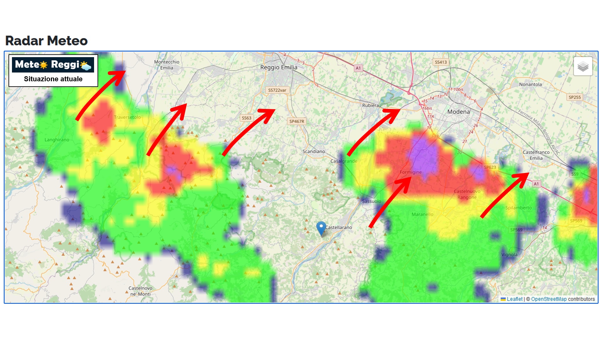 Nell'ultima ora abbiamo assistito alla crescita della cella temporalesca di Sassuolo che ora sta arrivando nel cuore di Modena, con forti rovesci che stanno già interessando la zona della Ghirlandina. Questo sistema temporalesco ha inibito e tenuto a distanza la cella reggiana del Crostolo che si mntiene abbastanza stabile tra la bassa valle dell'Enza e l'arrivo in Pianura del Crostolo a Puianello / Vezzano.