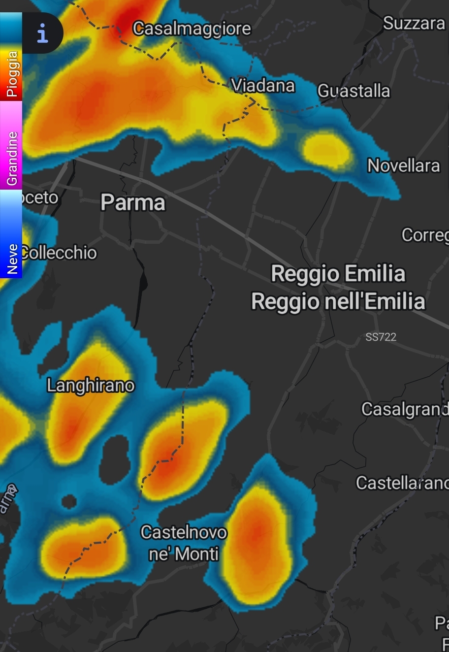 Si avvicina velocemente il sistema temporalesco di oggi pomeriggio. I primi tuoni riecheggiano nello stesso punto dei giorni scorsi sul nostro Appennino, tra Castelnovo ne' Monti e Carpineti. Qui si registrano anche i primi acquazzoni. La cellula si sposterà verso nord maturando ancora di dimensioni. Altre celle potranno svilupparsi nel breve termine anche più ad est.