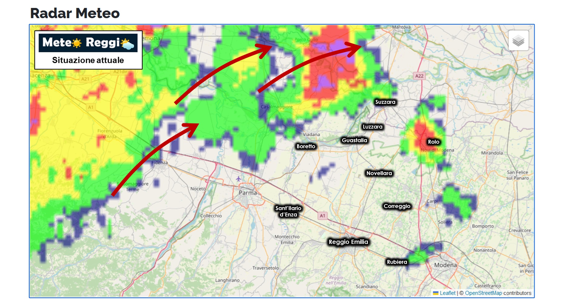 Anche oggi pomeriggio è la Pianura a vedere il transito di sistemi temporaleschi, sistemi che si originano sul più basso appennino parmense e transitano a nord del Po. Una seconda piccola cella si è sviluppata in questi ultimi minuti su Rolo, ma in spostamento verso nord-est.