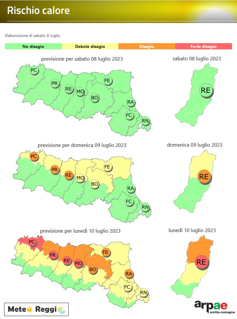Domenica avremo condizioni di debole disagio nelle campagne della Pianura reggiana che sale a vero e proprio disagio nei centri abitati e in Città. Questo per via dell'isola di calore, della pessima dispersione termica della notte e del maggior inquinamento. Un po' di brezza soffierà ancora, ma giorno dopo giorno è sempre meno efficace nel contenere l'effetto spiacevole dell'afa.