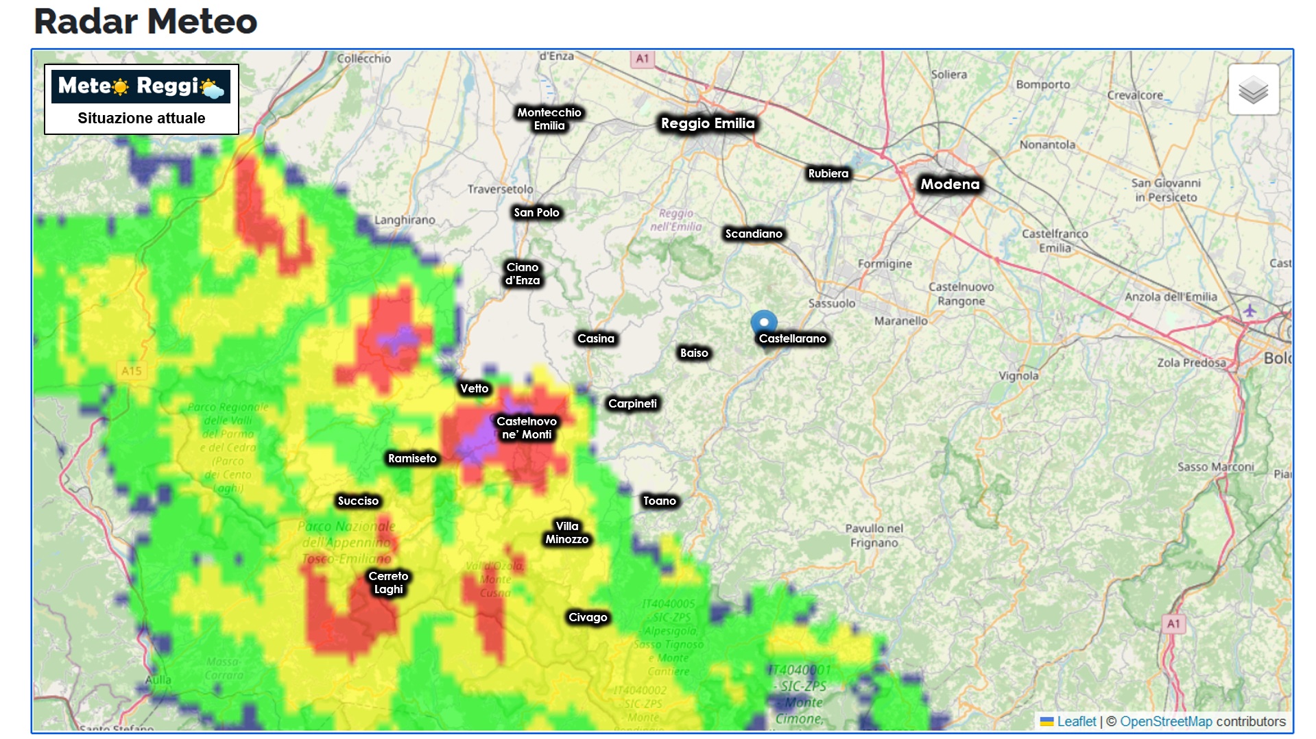 Rombi di tuono sul nostro Appennino dove abbiamo una vasta linea temporalesca che dal Crinale si spinge fino all'altezza di Castelnovo ne' Monti. Proprio qui, tra l'altro, abbiamo il nucleo più intenso con violente piogge e purtroppo anche un po' di grandine.
