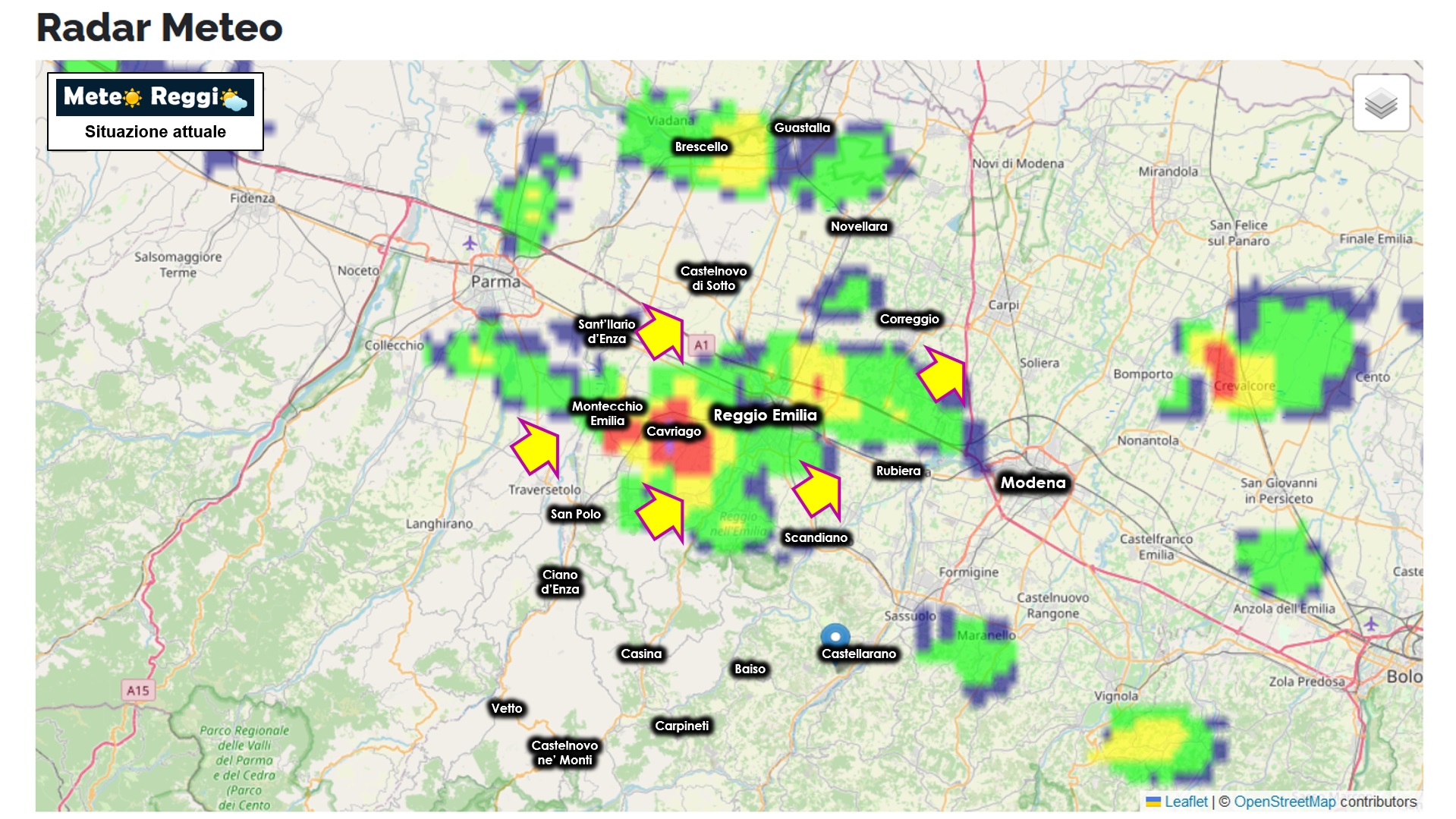 Una cella che sta portando forti piogge tra Montecchio Emilia e Cavriago, con probabilità molto alte di grandine a corredo. Questo nucleo si sta spostando progressivamente verso la periferia ovest di Reggio Emilia intenzionato a raggiungere la nostra Città.