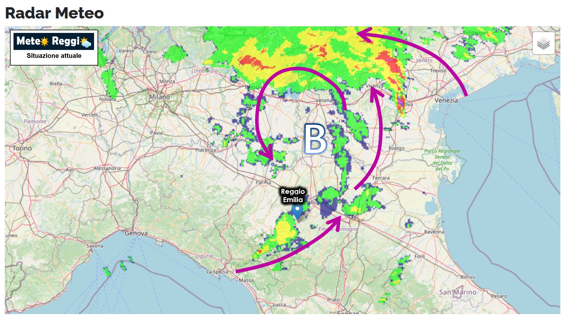 Tuttavia è ancora presto per riporre gli ombrelli, il vortice di bassa pressione che è transitato sulla nostra testa ora si trova nel mantovano e proseguirà il suo viaggio verso est. Questo prepara il terreno ad una "ritornante", ovvero, un ritorno delle piogge che questa volta non arriveranno dall'Appennino ma bensì dal Po.