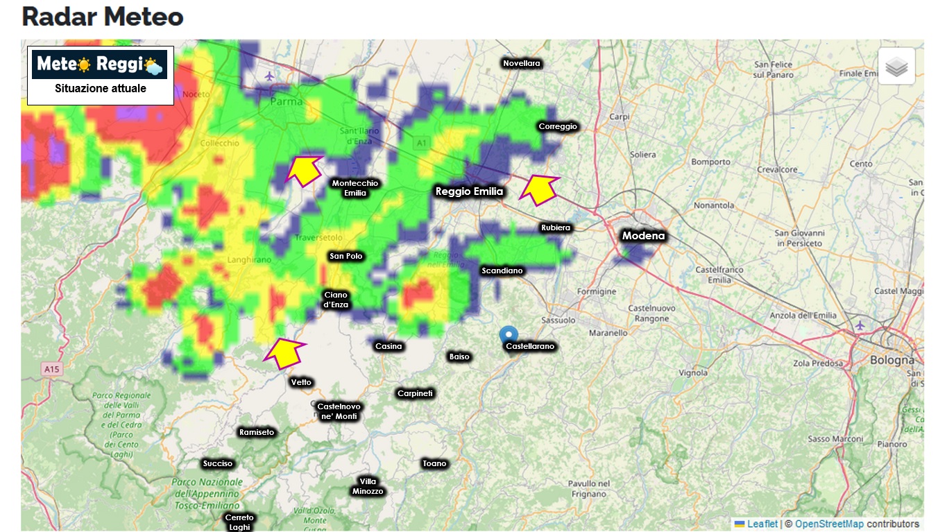 Resiste ancora una cella tra Tresinaro e Crostolo, tra Casola Querciola e Vezzano sul Crostolo (vedi webcam Baiso), che porta forti piogge, ma nessuna attività elettrica al seguito.