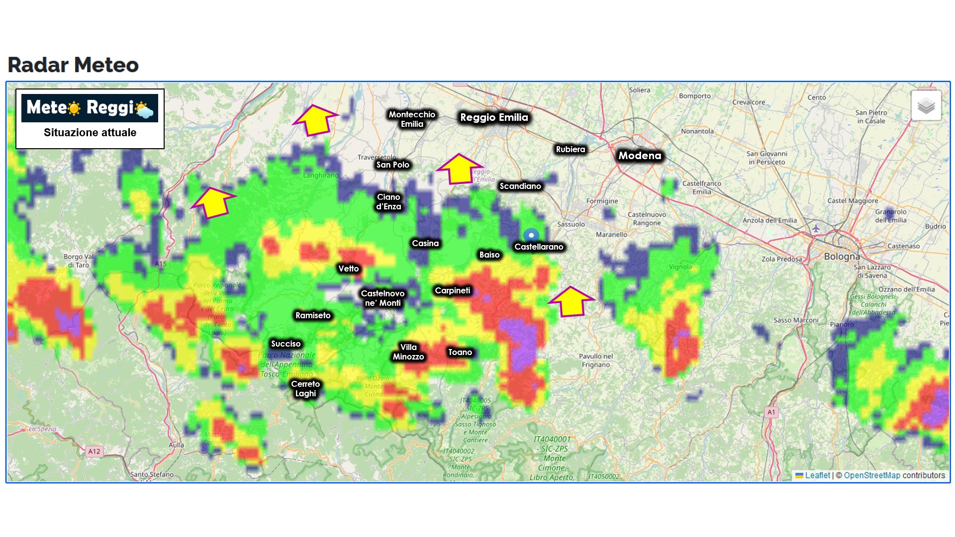Il nucleo più intenso è ancora sulla sponda modenese del Secchia, ma a breve giungerà su Baiso e la valle del Secchia.
