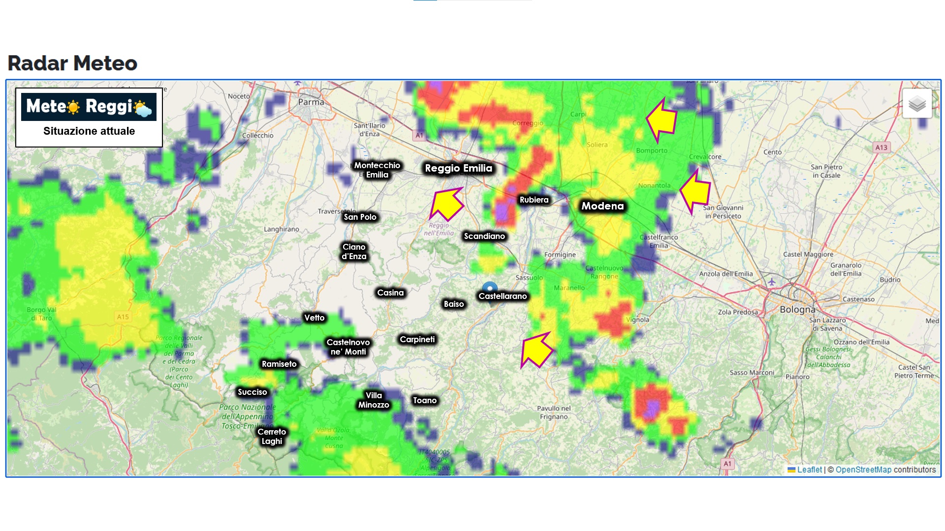 Dallo scontro delle due correnti sono nate diverse linee temporalesche che attraversano da est a ovest la Pianura. Una linea ha investito il comprensorio ceramico a nord di Scandiano e a breve raggiungerà Reggio Emilia.