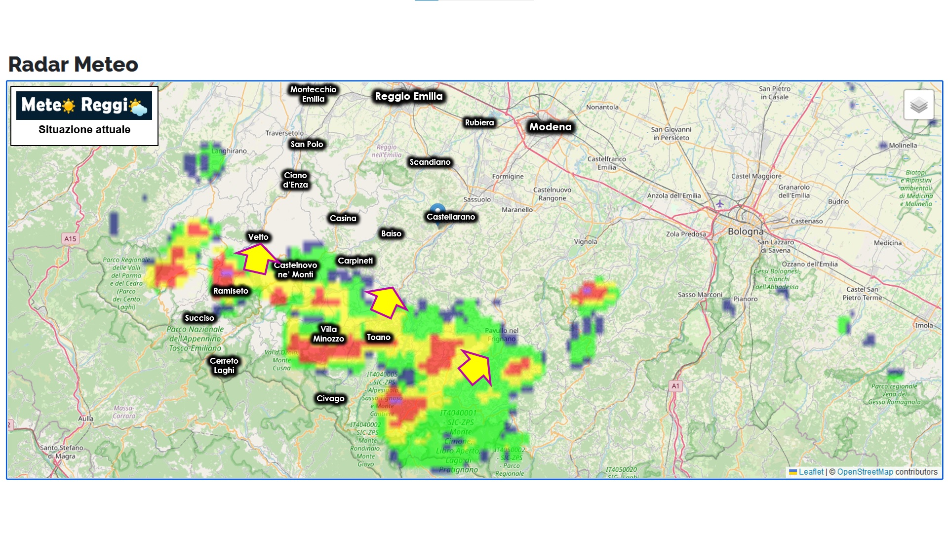 Al momento non si registrano grandinate, anche se una cella che a breve potrebbe generarne si trova tra Cereggio e Ramiseto.