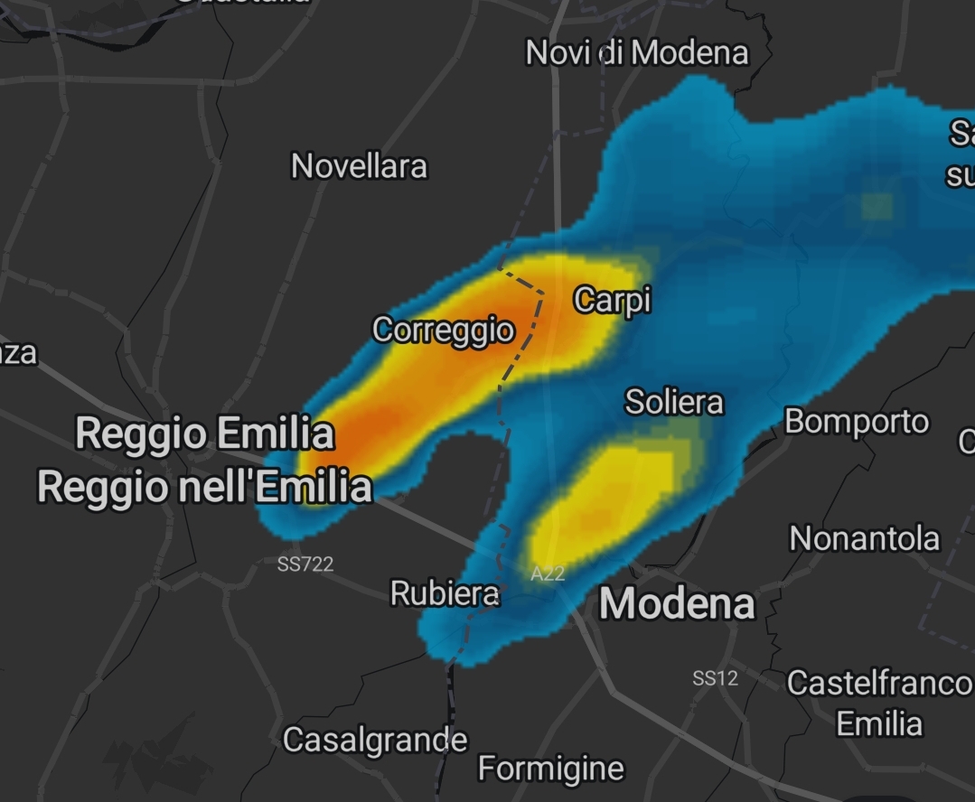 La nuvola di Reggio Emilia non si allontana dalla Città, forse alimentata dall'isola di calore urbana. Si è però estesa fino a Correggio e oltre, dandoci una chiara prospettiva del movimento delle correnti d'aria.
