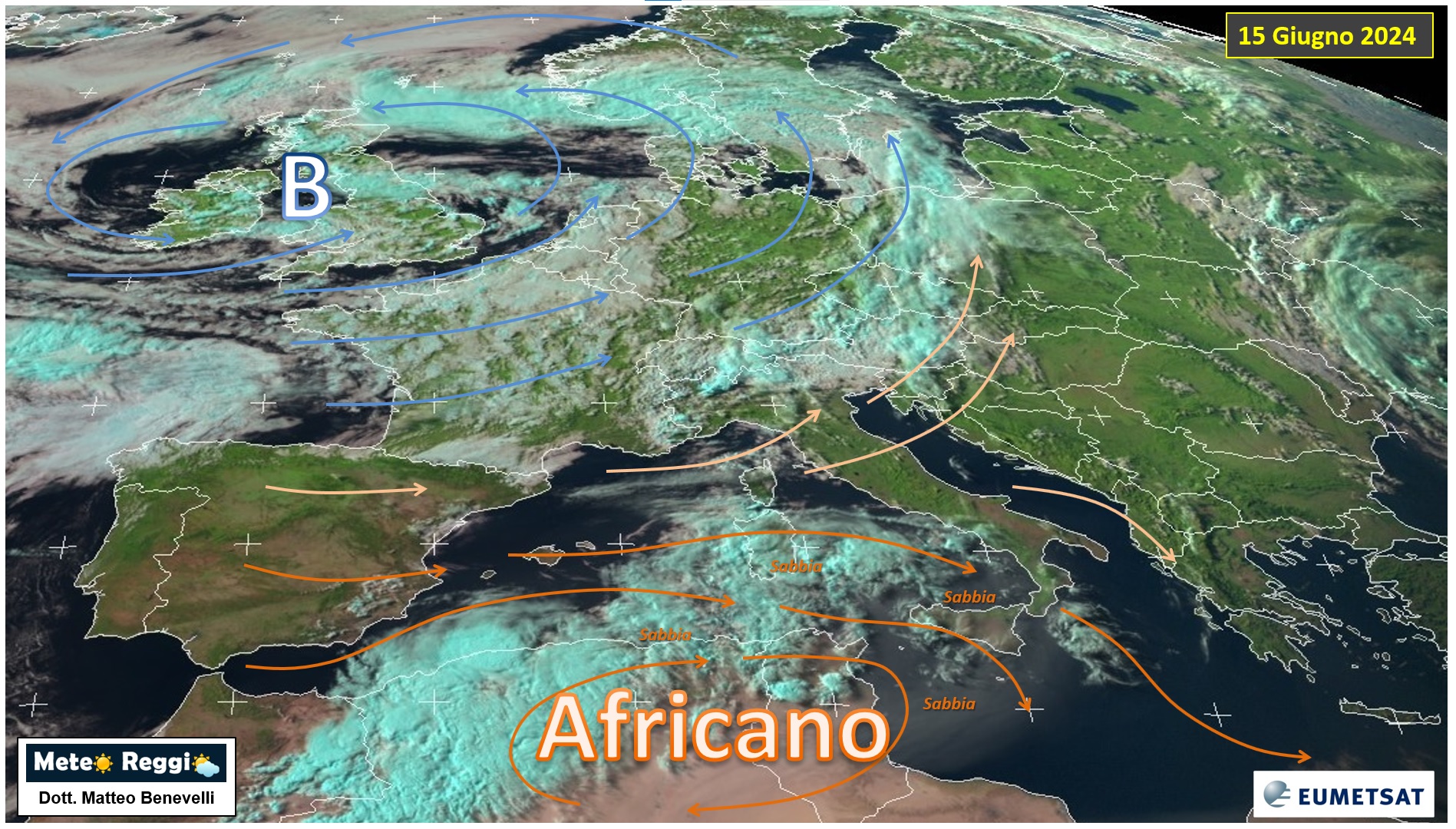 Da satellite la situazione è lampante, la nostra provincia si trova schiacciata tra due giganti "barici" che si contendono il dominio dell'Europa. Oltre le Alpi abbiamo un resco ciclone atlantico che soffia prepotente.